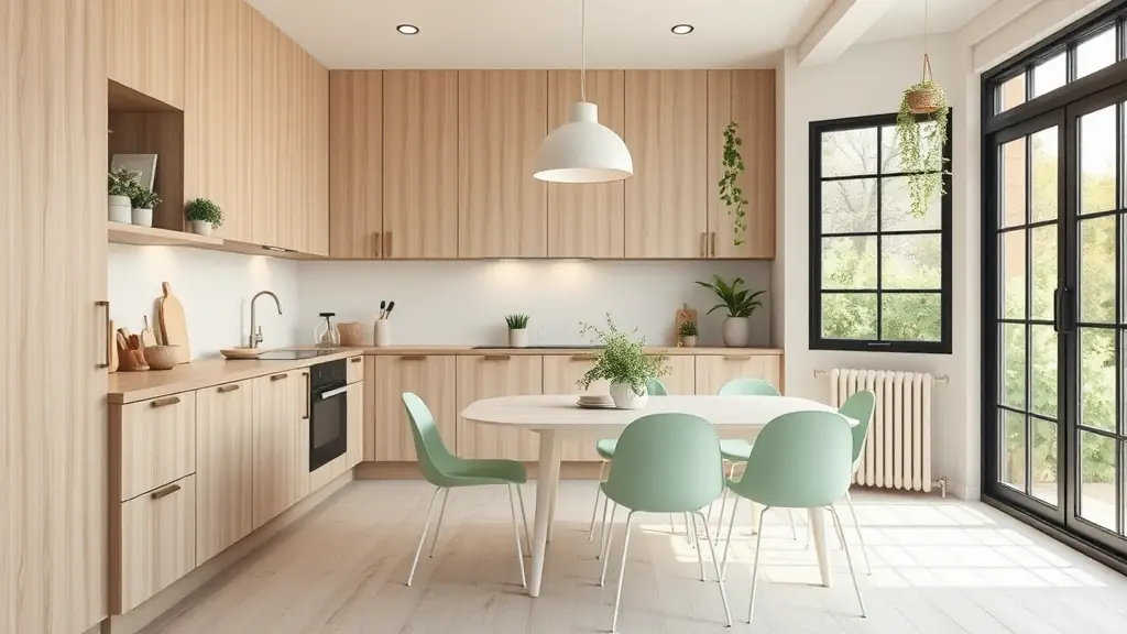 Pensez à incorporer des étagères ouvertes en bois brut pour exposer vos herbes aromatiques ou petits pots de fleurs. Ce type d’arrangement met la nature à l’intérieur sans surcharge visuelle. Le résultat ? Une atmosphère vivante et rafraîchissante.